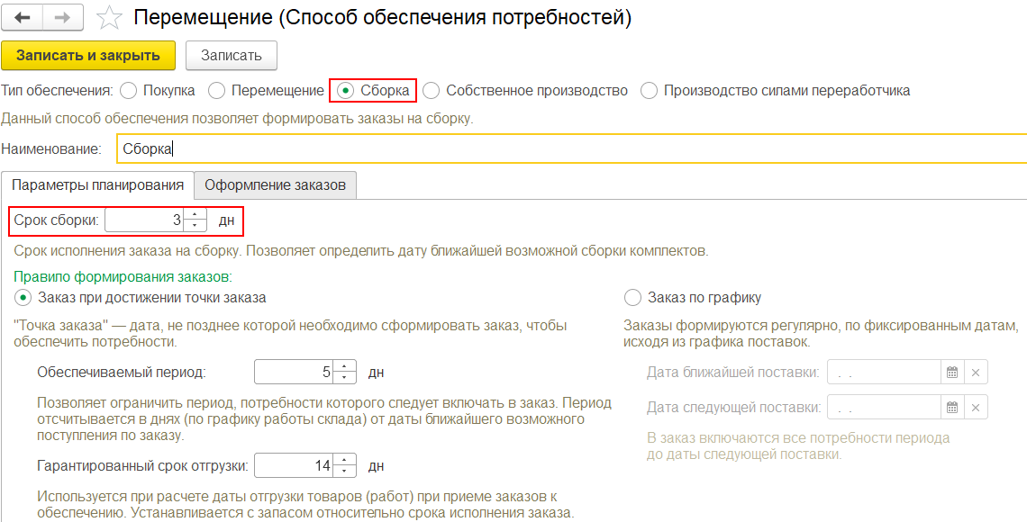 Тип обеспечения Сборка, используется, если номенклатура обеспечивается путем сборки новых комплектов из комплектующих. Данный способ обеспечения позволяет формировать заказы на сборку.