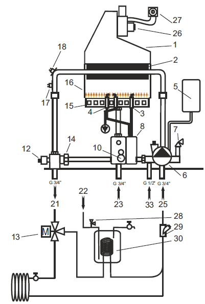 - Функциональная схема турбированного настенного газового котла MORA-TOP Helios 24 ST